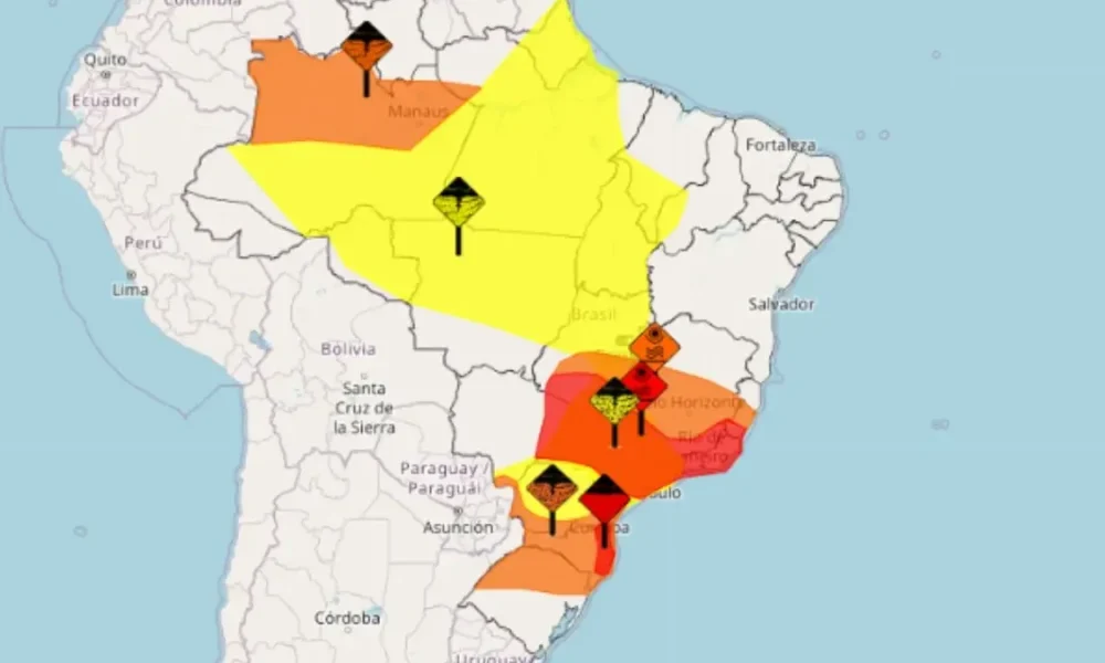 Inicialmente, a área de risco incluía também os estados de Santa Catarina e Paraná, que foram retirados do alerta de calor extremo. No entanto, essas regiões permanecem sob aviso de tempestades.