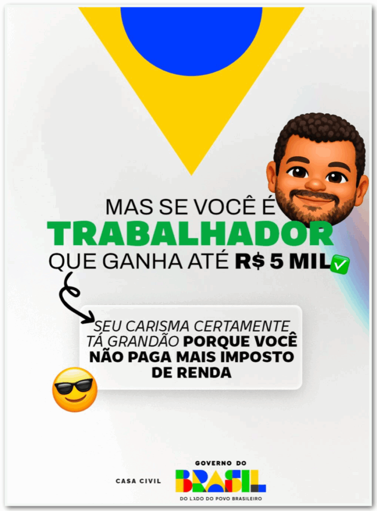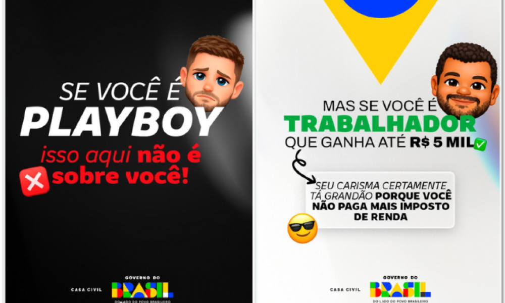 A primeira imagem dizia: “Se você é um playboy, isso aqui não é sobre você”. Já a segunda trazia outra frase: “Mas se você é trabalhador e ganha até R$ 5.000, seu carisma certamente tá grandão porque você não paga mais imposto de renda”.