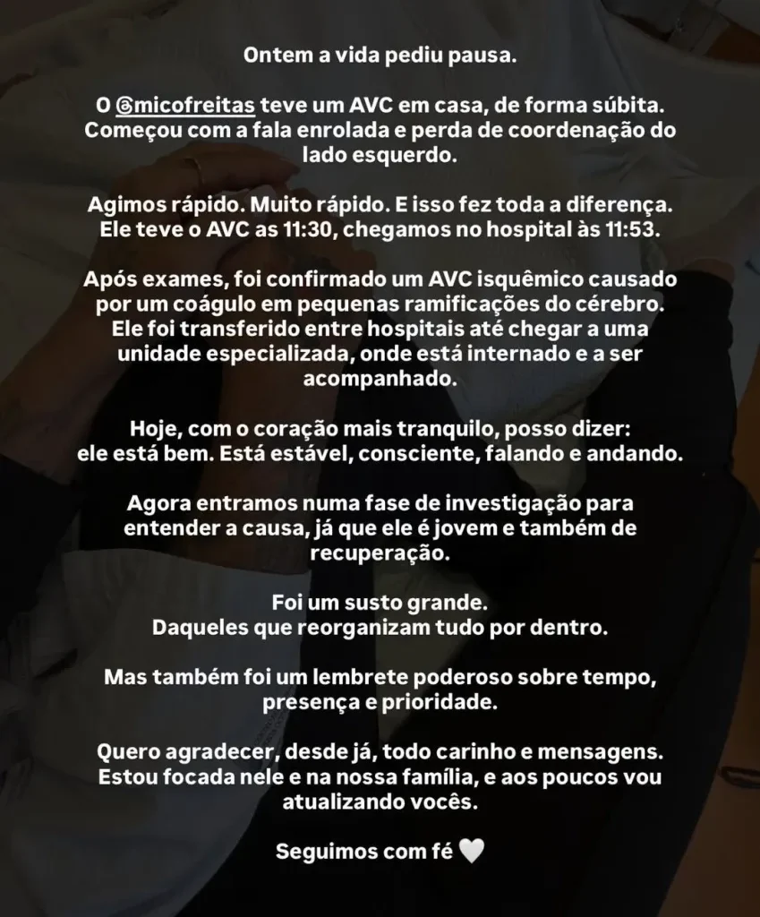 Ainda de acordo com a artista, o momento agora é de acompanhamento médico para identificar as causas do AVC, além do processo de recuperação. Ela agradeceu as mensagens de apoio recebidas e afirmou estar dedicada à família.
