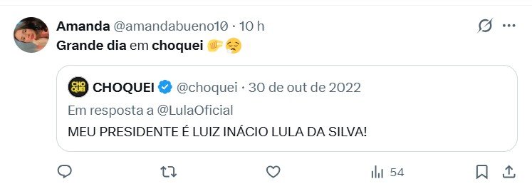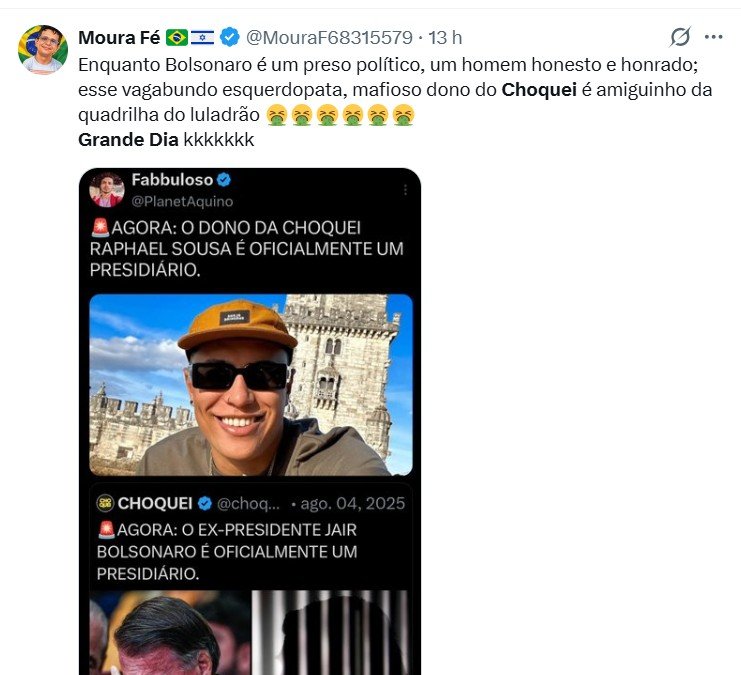 A página Choquei, que acumula mais de 36 milhões de seguidores nas redes sociais X e Instagram, ganhou destaque nos últimos anos por sua forte presença digital, mas também pelo alinhamento ao governo Lula (PT) em razão da proximidade de Raphael Sousa com a primeira-dama Janja. Durante as eleições de 2022, por sinal, a página escancarou seu viés em favor do petista com uma enxurrada de posts sobre o pleito.