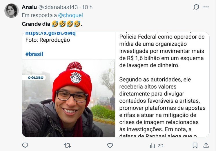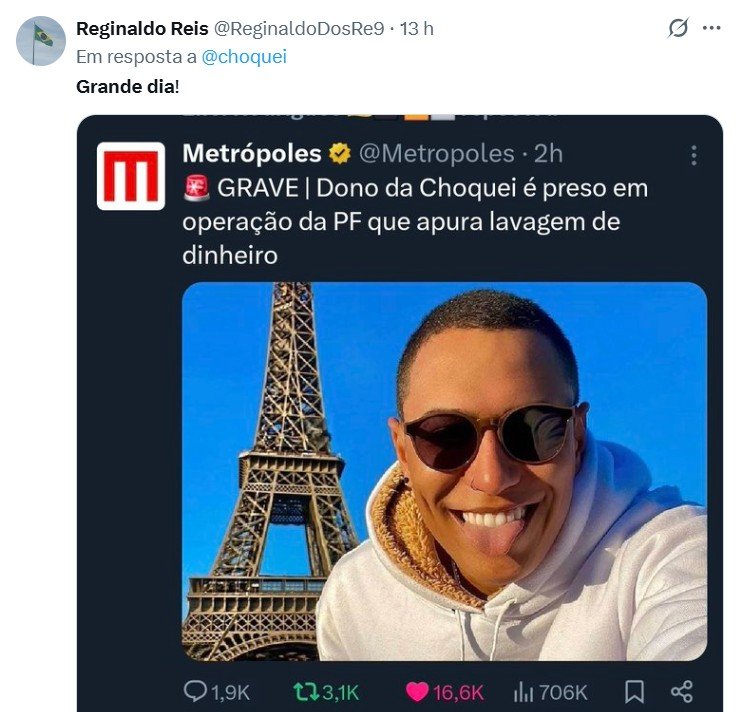 A prisão do influenciador Raphael Sousa Oliveira, dono da página Choquei, gerou forte repercussão nas redes sociais nesta quarta-feira (15), com a viralização de publicações que retomaram o bordão “grande dia”, popularizado pelo ex-presidente Jair Bolsonaro (PL).